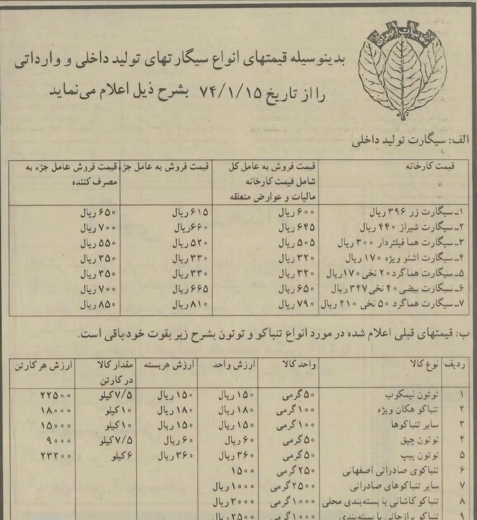به گزارش اطلاعات آنلاین، در فروردین ۱۳۷۴ به دنبال سیاستهای اقتصادی دولت وقت، نرخ رسمی و مصوب انواع کالاهای مصرفی اعلام شد. شرکت دخانیات ایران نیمه فروردین ۱۳۷۴ نرخنامه انواع سیگار ایرانی، توتون و تنباکو را اعلام کرد. این نرخنامه را به نقل از روزنامه اطلاعات ۲۳ فروردین ۱۳۷۴ بخوانید و عکسی از بازار غیر رسمی سیگار خارجی در همان سال تماشا کنید.